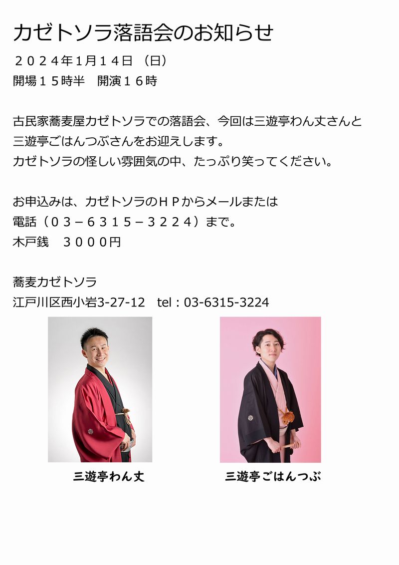 カゼトソラ落語会 Tweet 日程 公 演 日 2024/01/14 開演時間 16:00 場所 蕎麦カゼトソラ 出演者 三遊亭わん丈 三遊亭ごはんつぶ チケット 3,000円 蕎麦カゼトソラ 江戸川区西小岩3-27-12 tel:03-6315-3224 小岩の古民家蕎麦屋での第5回目の落語会です。 怪しい雰囲気の蕎麦屋で落語をお楽しみください。