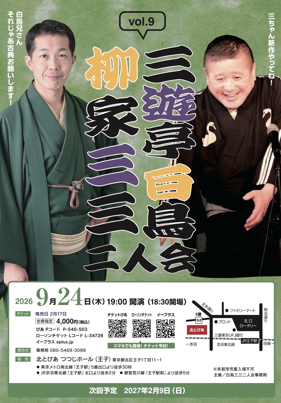 三遊亭白鳥 柳家三三 二人会 Vol.9 Tweet 日程 公 演 日 2026/09/24 開演時間 19:00 場所 北とぴあ つつじホール(東京都) 出演者 三遊亭白鳥 / 柳家三三 チケット 全席指定 4,000円 ぴあ 二人会事務局:080-5469-3088