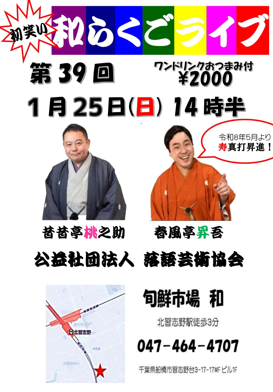和らくごライブ Tweet 日程 公 演 日 2026/01/25 開演時間 14:30 場所 旬鮮市場 和 出演者 昔昔亭桃之助 春風亭昇吾 チケット ¥2000 ワンドリンクおつまみ付き 北習志野・旬鮮市場和 047-464-4707