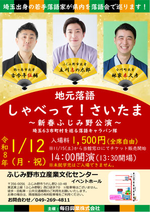 埼玉県出身の若手落語家、古今亭伝輔(鶴ヶ島出身)、立川志の太郎(ふじみ野市出身)、林家木久彦(小川町出身)が県内63市町村を落語で巡る企画。