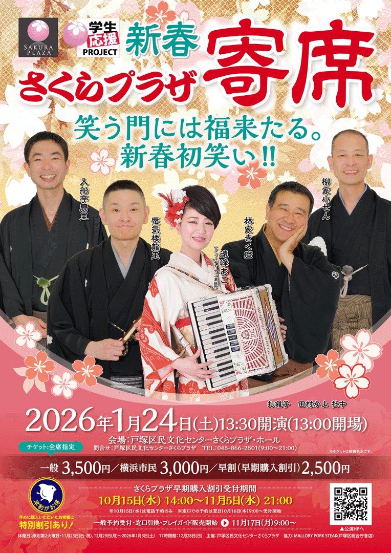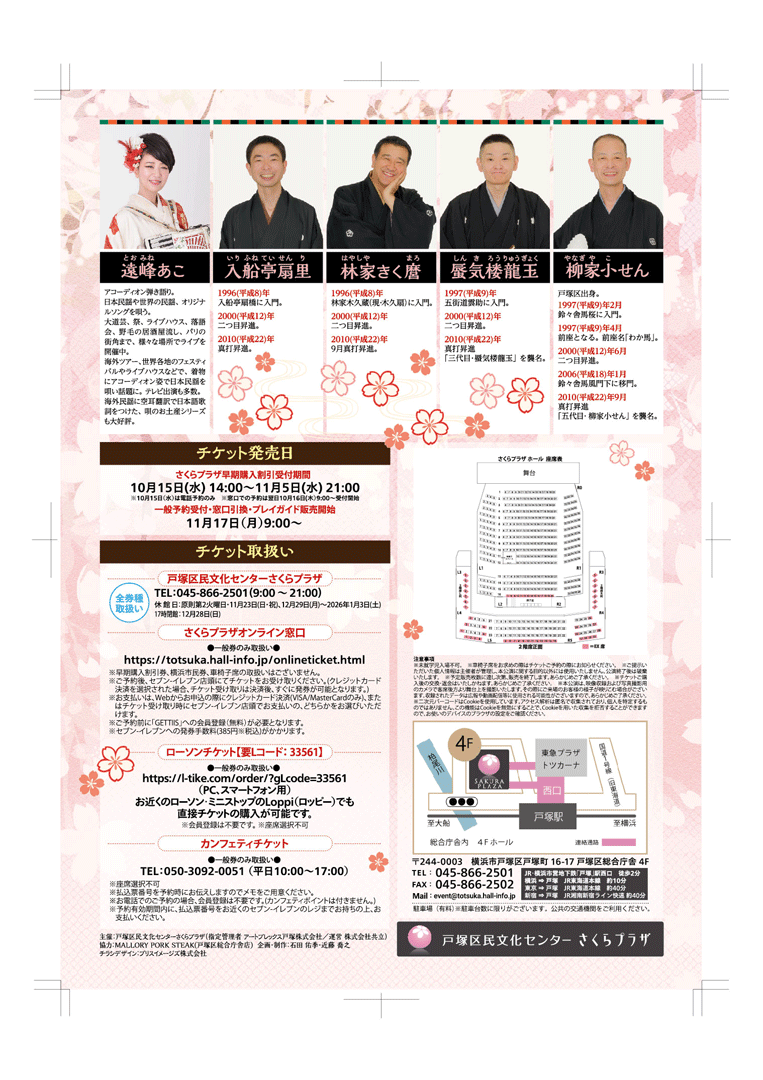 ◇公演の見どころ:出演は横浜市戸塚区出身の真打、柳家小せん、同期真打の蜃気楼龍玉、林家きく麿、入船亭扇里、アコーディオン漫謡の遠峰あこを迎え、豪華に送る。