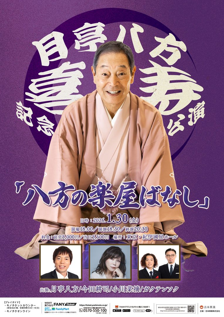 楽屋には愛がある、楽屋には夢がある、楽屋には希望がある、そして楽屋には、喜寿を迎えた月亭八方渾身の楽屋ばなしが・・・。