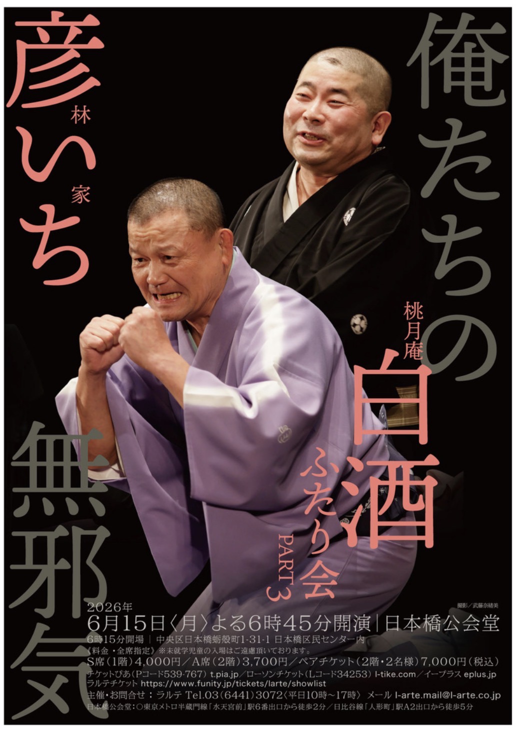 林家彦いち 桃月庵白酒ふたり会 俺たちの無邪気PART3 Tweet 日程 公 演 日 2026/06/15 開演時間 18:45 場所 日本橋公会堂(日本橋劇場) (東京都) 出演者 林家彦いち / 桃月庵白酒 チケット S席(1階)4,000円 A席(2階)3,700円 ぴあ ラルテ:03-6441-3072