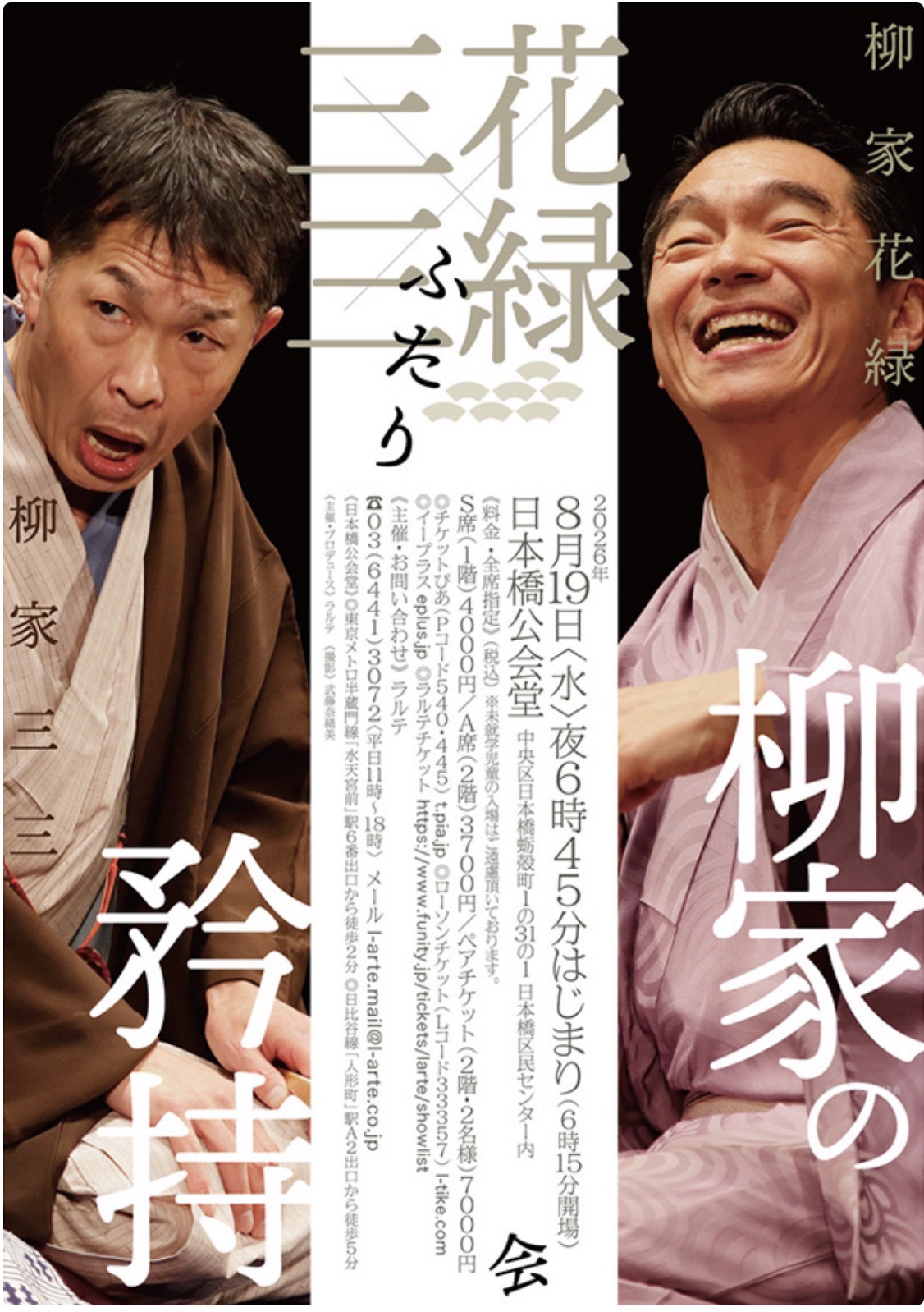 柳家花緑 柳家三三 ふたり会 Tweet 日程 公 演 日 2026/08/19 開演時間 18:45 場所 日本橋公会堂(日本橋劇場) (東京都) 出演者 柳家花緑 / 柳家三三 チケット S席(1階)4,000円 A席(2階)3,700円 ぴあ ラルテ:03-6441-3072
