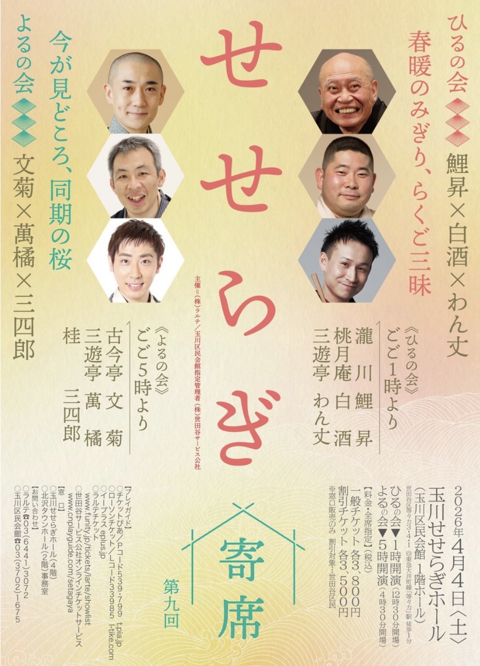 第九回せせらぎ寄席 ひるの会 Tweet 日程 公 演 日 2026/04/04 開演時間 13:00 場所 玉川せせらぎホール(玉川民会館) 出演者 瀧川鯉昇 / 桃月庵白酒 / 三遊亭わん丈 チケット 全席指定 3,800円 ぴあ ラルテ:03-6441-3072