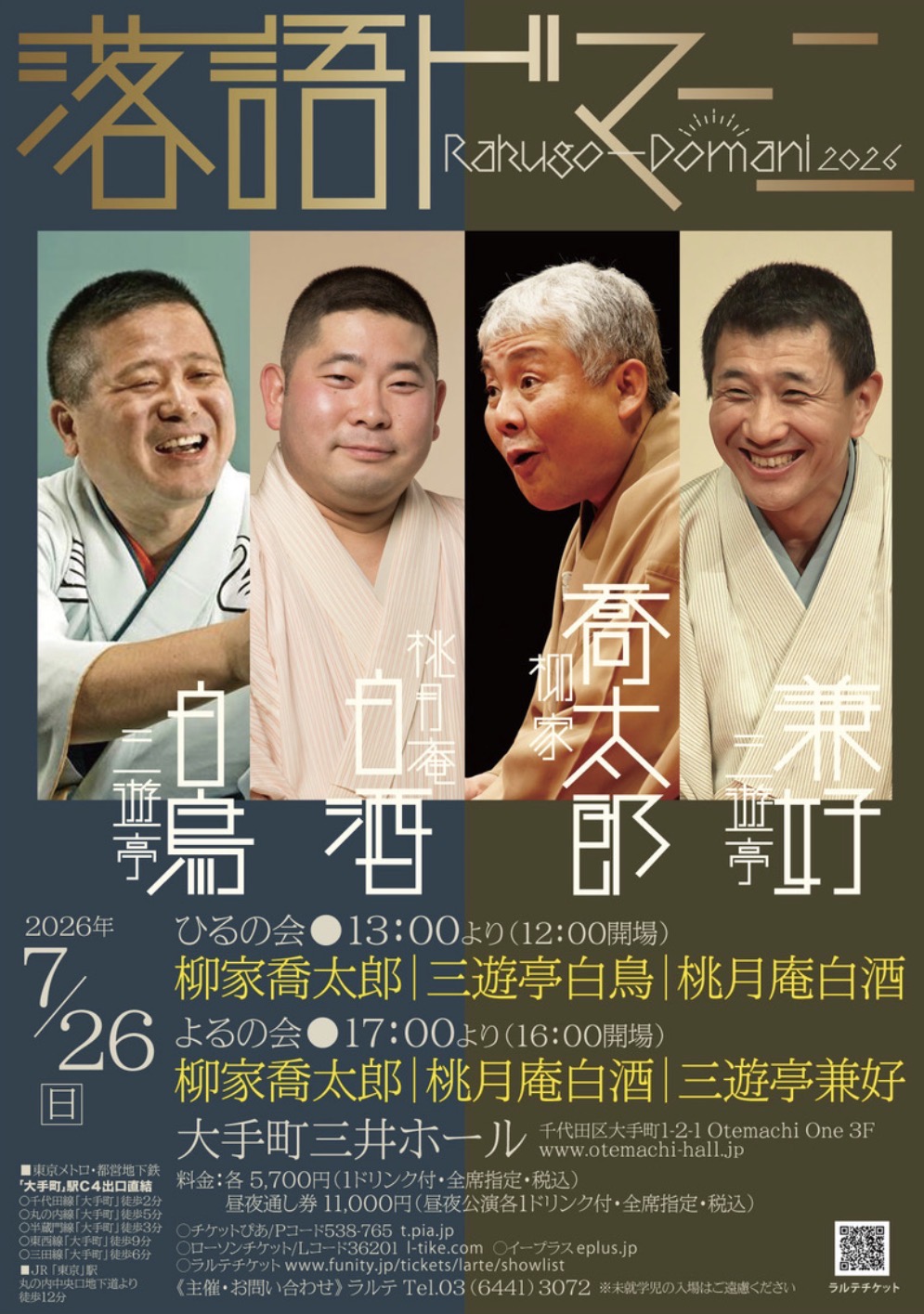 落語ドマーニ2026 ひるの会 Tweet 日程 公 演 日 2026/07/26 開演時間 13:00 場所 大手町三井ホール (東京都) 出演者 柳家喬太郎 / 三遊亭白鳥 / 桃月庵白酒 チケット 全席指定 1ドリンク付き 5,700円 ぴあ ラルテ:03-6441-3072