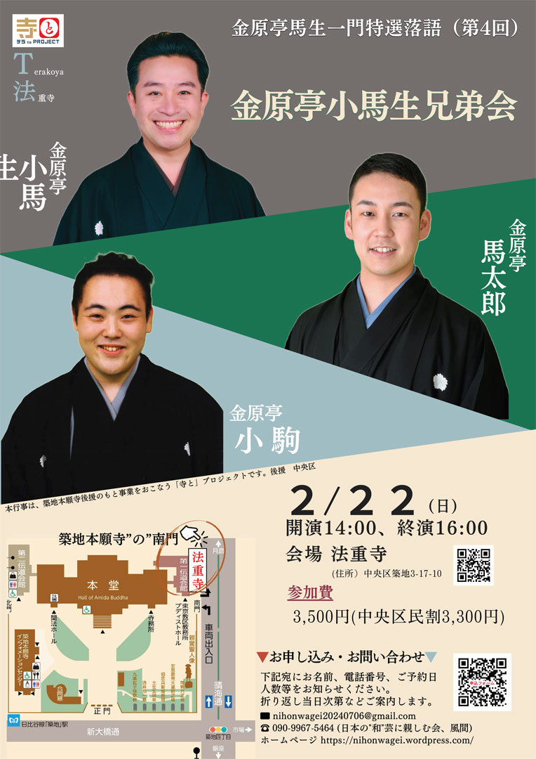 中央区・築地本願寺のお膝元「法重寺」にて、毎月開催されている金原亭馬生一門特選落語。2月は、金原亭小馬生師匠と金原亭小駒さん、馬吉さんによる兄弟会です。凸凹兄弟の個性が爆発する一席をどう小馬生師匠がまとめるかが見どころの本席をお見逃しなく!