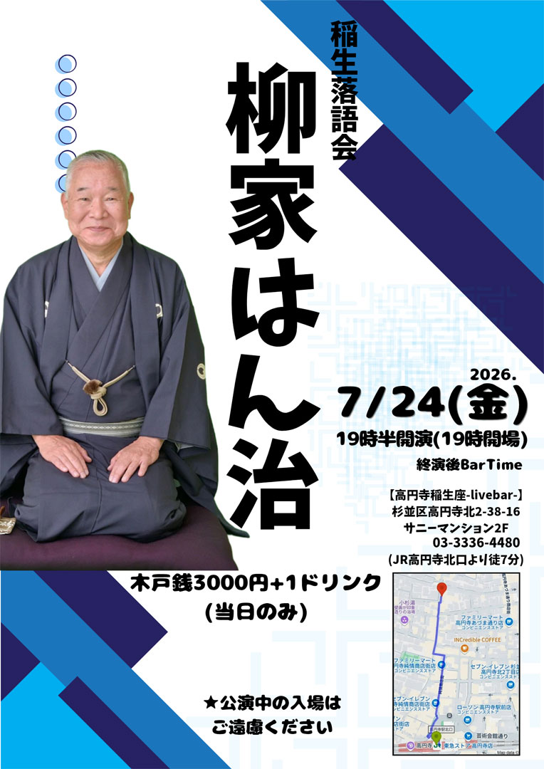 公演スケジュール 検索 日程 〜 都市 全ての都市 東京都 神奈川県 47 Miller Cres 59 Abbotsleigh St 63 Hardgrave Road 75 Shellcove Rd adatiku Flinders Lane Frankfurt Germain St, Las Vegas Mangilao Orlando Tumon さいたま市 つくば市 一宮市 七日町 三弥町 三重県 世田谷区 中区 中央区 中央区千日前2-3-9 中野区 中頭郡 二本松市 京京都 京都府 佐倉市 佐賀県 入間市 兵庫県 前橋 北区 北海道 千代田区 千葉市 千葉県 南7条西2丁目 只見町 台東区 名古屋市 名護市 国分寺市 埼玉県 埼玉県1 大分県 大字富沢 大町 大阪市 大阪府 天童市 守山区 守山市 安達郡 宮城県 宮崎県 富士吉田市 富山県 小川町19-5 小野川町 尼崎市 山口県 山形県 山梨県 岐阜市 岐阜県 岡山県 岩手県 島根県 帯屋町2-5-23 広島県 徳島県 愛媛県 愛知県 我孫子市 所沢市 新宿 新宿区 新居浜市 新潟県 日本 旭川市 春日井市 最上郡 杉並区 東京 東京都 栃木 栃木市 栃木県 横浜市 江東区 沖縄県 津市 浜松市 浜松市中区 浦安市 渋谷区 港区 滋賀県 熊本県 石川県 磯子区 神奈川 神奈川県 福井市 福井県 福岡県 福島県 秋田県 米沢市 練馬区 群馬県 羽所町 習志野市 茅ヶ崎市 茨城県 茨木県 茨茨城 草加市 荒川区 藤沢市 虻田郡 西区 豊島区 豊橋市 越谷市 那覇市 郡山市 鎌倉市 鎌田本町 長崎県 長野県 青森県 静岡市 静岡県 静静岡 須賀川市 飯能市 駿河区 高崎市 高知県 鴻巣市 鹿児島 鹿児島県 オプション隠す オプション表示 7月 2026年 日時 公演概要 2026/07/09 19:00 わん丈ストリートVol.50 【場所】日本橋公会堂(日本橋劇場) (東京都), 東京都 三遊亭わん丈 2026/07/11 14:00 市川寄席 【場所】市川市文化会館, 千葉県 立川吉笑、立川志ら鈴、橘家文吾 2026/07/24 19:30 稲生落語会『柳家はん治』 【場所】稲生座-LiveBar-, 東京都 柳家はん治 2026/07/26 13:00 落語ドマーニ2026 ひるの会 【場所】大手町三井ホール (東京都), 東京都 柳家喬太郎 / 三遊亭白鳥 / 桃月庵白酒 2026/07/26 17:00 落語ドマーニ2026 よるの会 【場所】大手町三井ホール (東京都), 東京都 柳家喬太郎 / 桃月庵白酒 / 三遊亭兼好 8月 2026年 日時 公演概要 2026/08/20 19:00 熱海の夜~第二十一夜 夏~入船亭扇遊独演会 【場所】日本橋社会教育会館ホール(東京都), 東京都 入船亭扇遊 < 1 2 3 4 5
