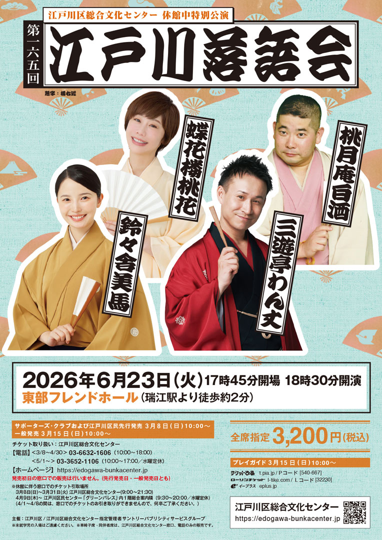 公演スケジュール 検索 日程 〜 都市 全ての都市 東京都 神奈川県 47 Miller Cres 59 Abbotsleigh St 63 Hardgrave Road 75 Shellcove Rd adatiku Flinders Lane Frankfurt Germain St, Las Vegas Mangilao Orlando Tumon さいたま市 つくば市 一宮市 七日町 三弥町 三重県 世田谷区 中区 中央区 中央区千日前2-3-9 中野区 中頭郡 二本松市 京京都 京都府 佐倉市 佐賀県 入間市 兵庫県 前橋 北区 北海道 千代田区 千葉市 千葉県 南7条西2丁目 只見町 台東区 名古屋市 名護市 国分寺市 埼玉県 埼玉県1 大分県 大字富沢 大町 大阪市 大阪府 天童市 守山区 守山市 安達郡 宮城県 宮崎県 富士吉田市 富山県 小川町19-5 小野川町 尼崎市 山口県 山形県 山梨県 岐阜市 岐阜県 岡山県 岩手県 島根県 帯屋町2-5-23 広島県 徳島県 愛媛県 愛知県 我孫子市 所沢市 新宿 新宿区 新居浜市 新潟県 日本 旭川市 春日井市 最上郡 杉並区 東京 東京都 栃木 栃木市 栃木県 横浜市 江東区 沖縄県 津市 浜松市 浜松市中区 浦安市 渋谷区 港区 滋賀県 熊本県 石川県 磯子区 神奈川 神奈川県 福井市 福井県 福岡県 福島県 秋田県 米沢市 練馬区 群馬県 羽所町 習志野市 茅ヶ崎市 茨城県 茨木県 茨茨城 草加市 荒川区 藤沢市 虻田郡 西区 豊島区 豊橋市 越谷市 那覇市 郡山市 鎌倉市 鎌田本町 長崎県 長野県 青森県 静岡市 静岡県 静静岡 須賀川市 飯能市 駿河区 高崎市 高知県 鴻巣市 鹿児島 鹿児島県 オプション隠す オプション表示 6月 2026年 日時 公演概要 2026/06/14 14:00 第59回鎌倉名人会「柳家喬太郎 独演会」 【場所】鎌倉芸術館 小ホール(神奈川県), 神奈川県 柳家喬太郎 2026/06/15 18:45 林家彦いち 桃月庵白酒ふたり会 俺たちの無邪気PART3 【場所】日本橋公会堂(日本橋劇場) (東京都), 東京都 林家彦いち / 桃月庵白酒 2026/06/19 14:00 神保町 立川半四楼落語会 【場所】らくごカフェ, 東京都 立川半四楼 2026/06/20 14:00 プライム寄席 桂宮治独演会 【場所】ひらしん平塚文化芸術ホール, 神奈川県 桂宮治 2026/06/20 18:00 妄想寄席 ~新作落語家の頭の中~ 【場所】兜座, 東京都 古今亭駒治 2026/06/23 18:30 第165回江戸川落語会 【場所】東部フレンドホール, 東京都 桃月庵白酒、蝶花楼桃花、三遊亭わん丈、鈴々舎美馬 7月 2026年 日時 公演概要 2026/07/04 14:00 第十回扇橋を聴く会 【場所】横浜にぎわい座 のげシャーレ(小ホール) (神奈川県), 神奈川県 入船亭扇橋 2026/07/11 14:00 市川寄席 【場所】市川市文化会館, 千葉県 立川吉笑、立川志ら鈴、橘家文吾 2026/07/26 13:00 落語ドマーニ2026 ひるの会 【場所】大手町三井ホール (東京都), 東京都 柳家喬太郎 / 三遊亭白鳥 / 桃月庵白酒 2026/07/26 17:00 落語ドマーニ2026 よるの会 【場所】大手町三井ホール (東京都), 東京都 柳家喬太郎 / 桃月庵白酒 / 三遊亭兼好 8月 2026年 日時 公演概要 2026/08/20 19:00 熱海の夜~第二十一夜 夏~入船亭扇遊独演会 【場所】日本橋社会教育会館ホール(東京都), 東京都 入船亭扇遊 < 1 2 3 4 5 6